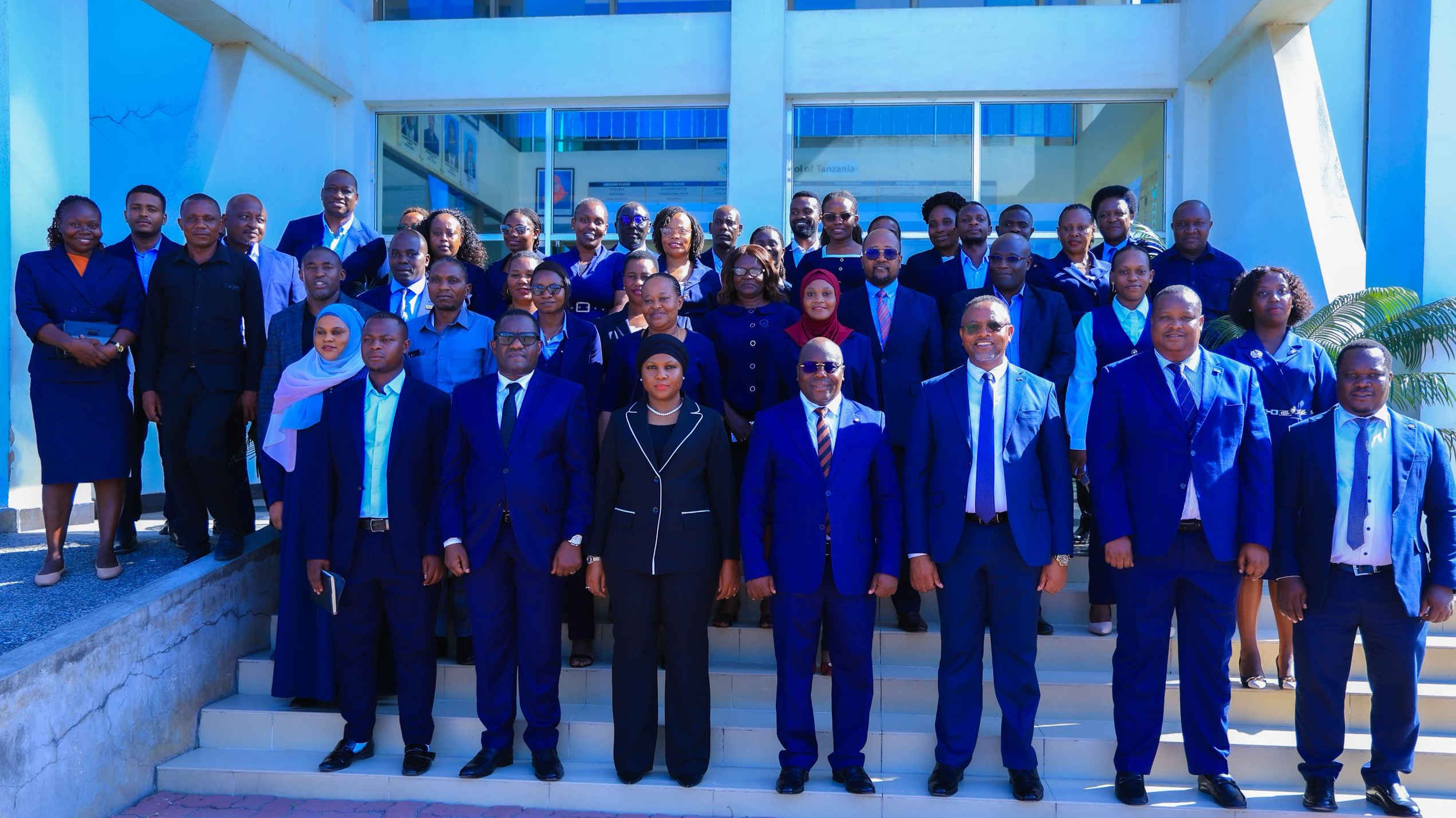 Waziri wa Katiba na Sheria Mhe. Dkt. Juma Homera (aliyesimama katikati mstari wa mbele) akiwa na Menejimenti pamoja na W...